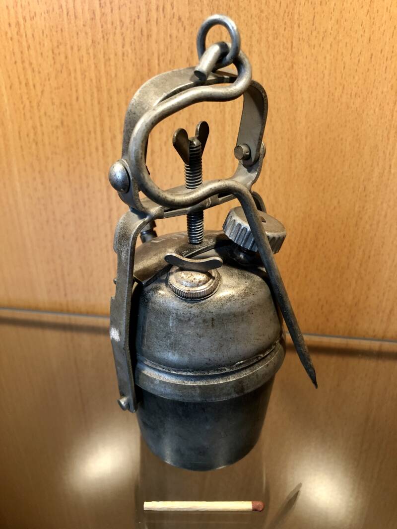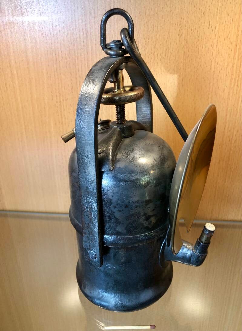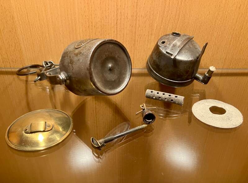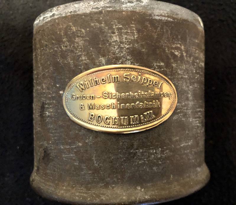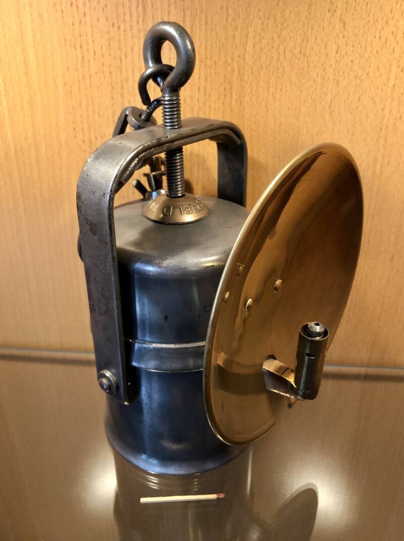 Iron Cap Lamp with Brass Name Tag on the Carbide Canister.