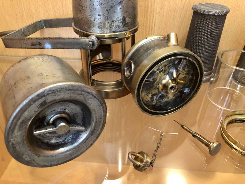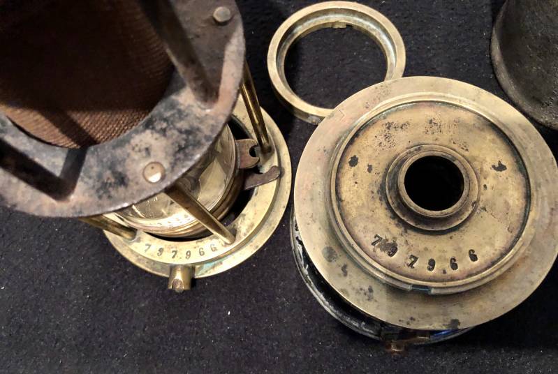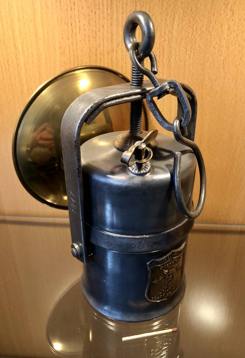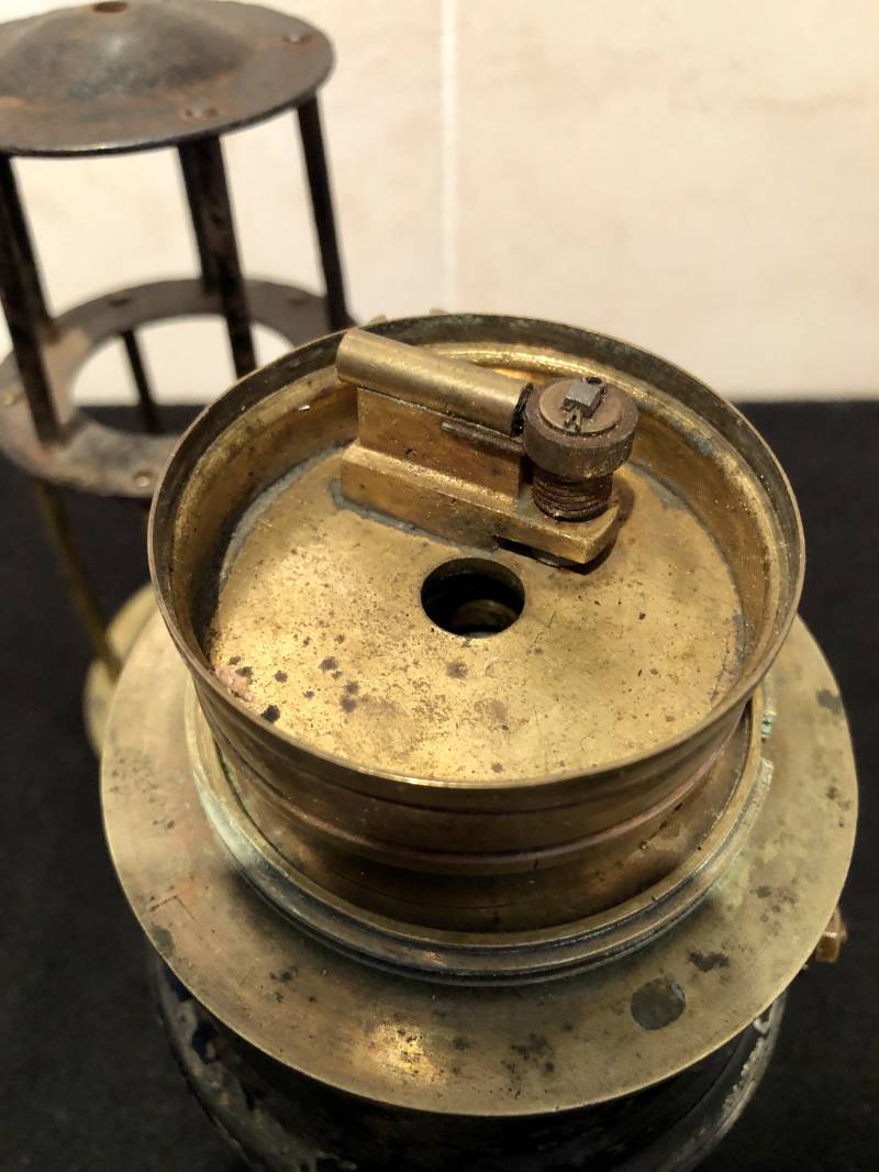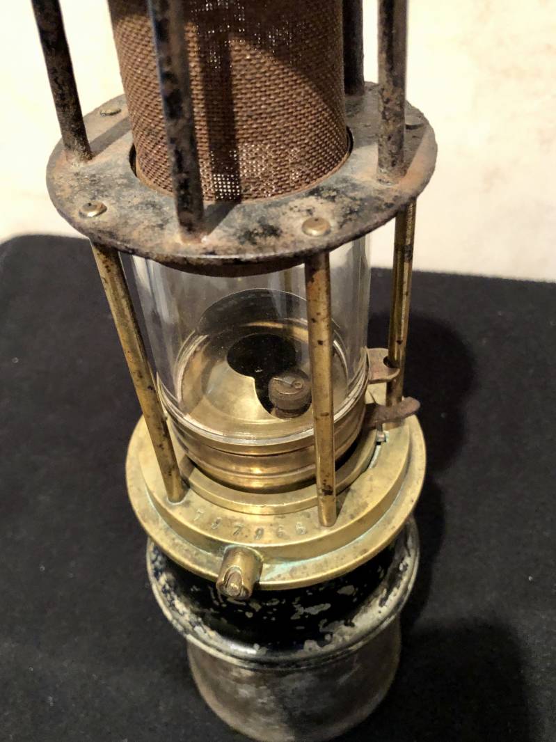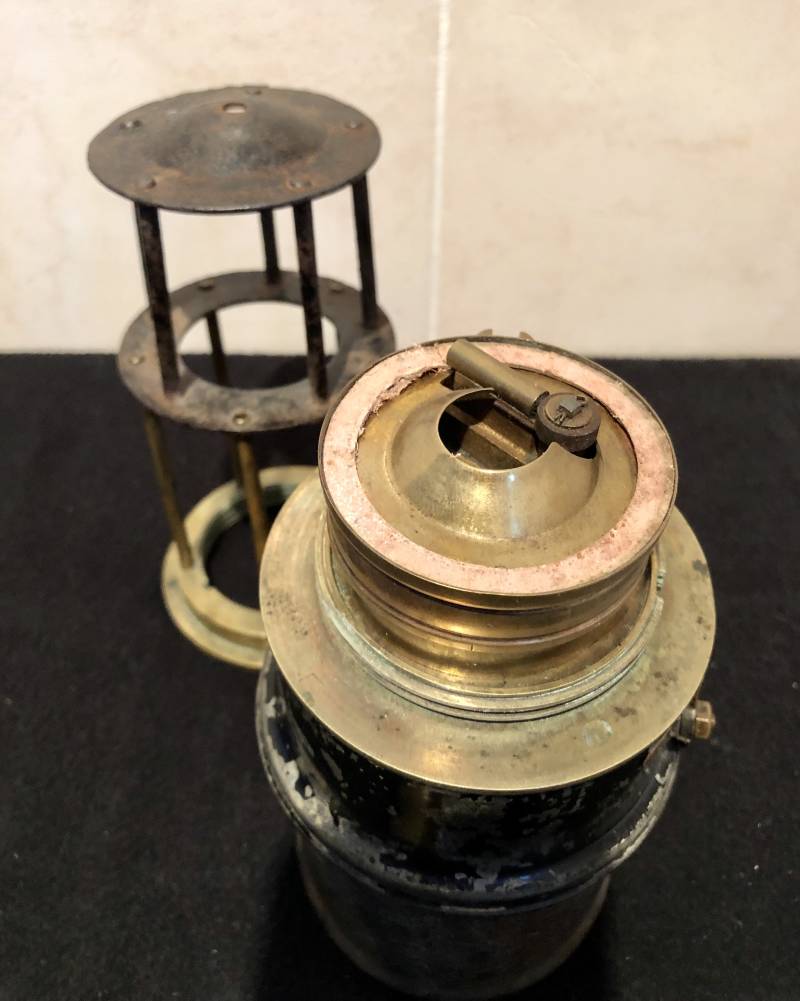 Rare Carbide Safety Lamp. Upper Part is all Original. The Numbers on the Water Tank and Upper Cage are Identical (see Pictures).
