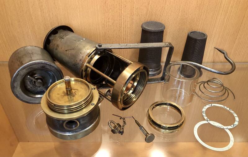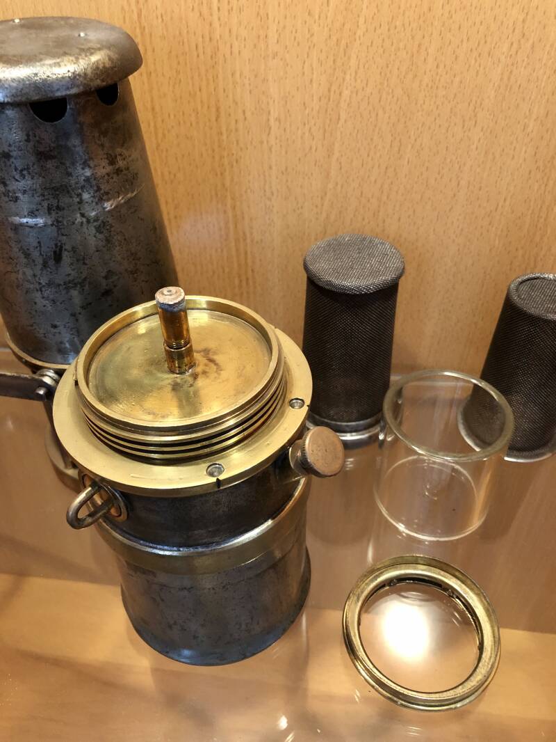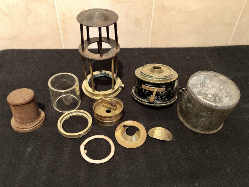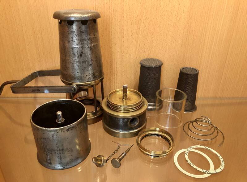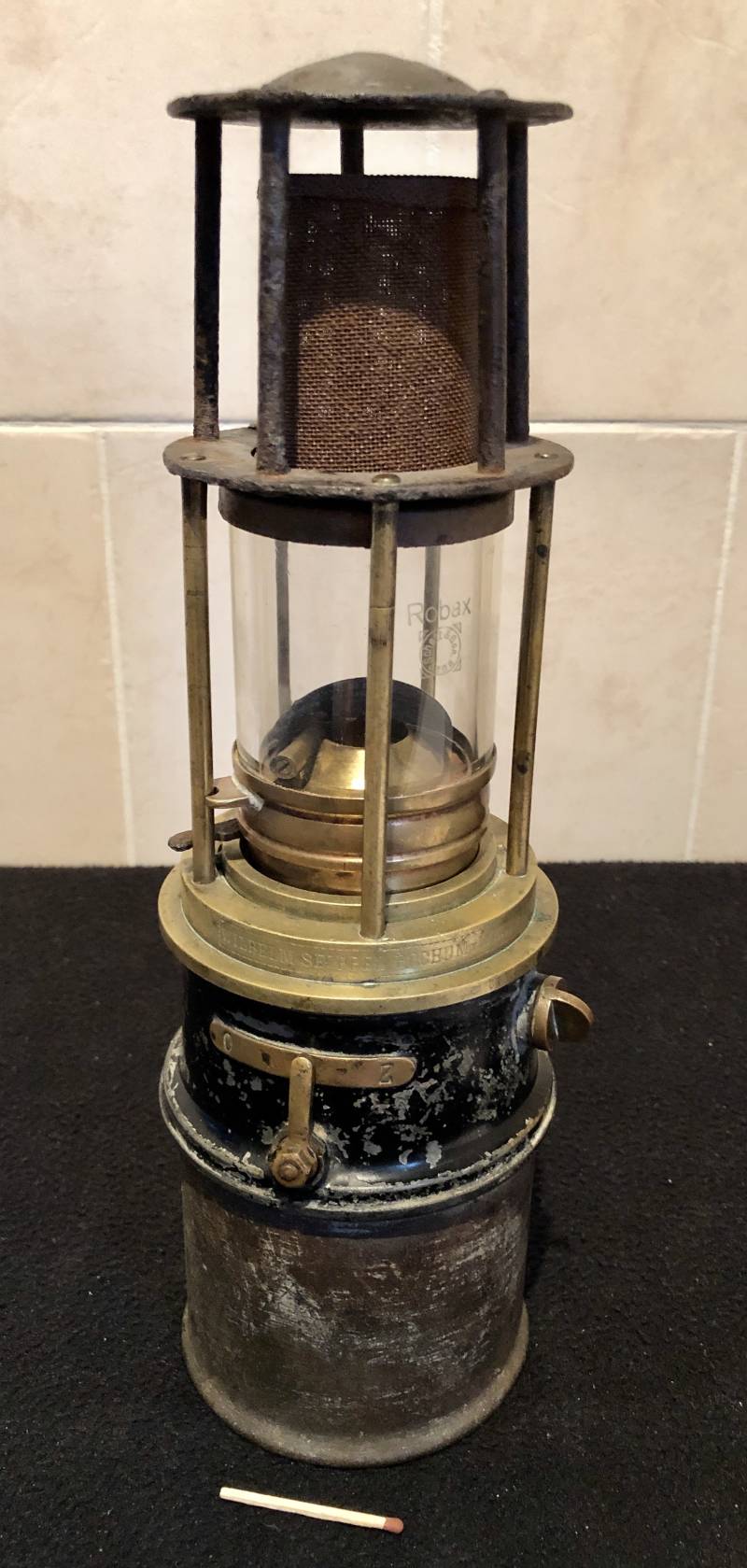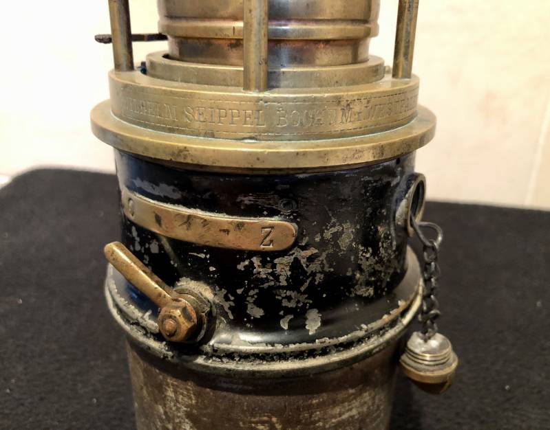 Rare Carbide Safety Lamp. Upper Part is all Original. The Numbers on the Water Tank and Upper Cage are Identical (see Pictures).