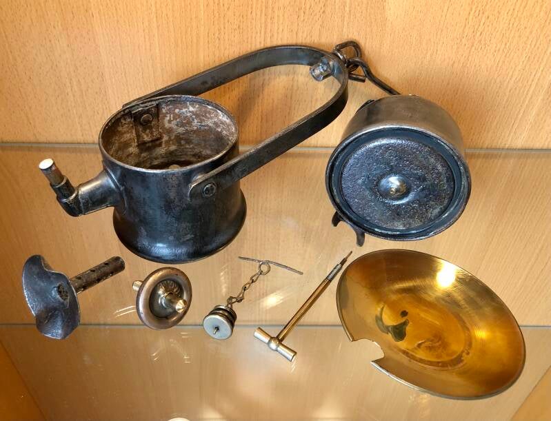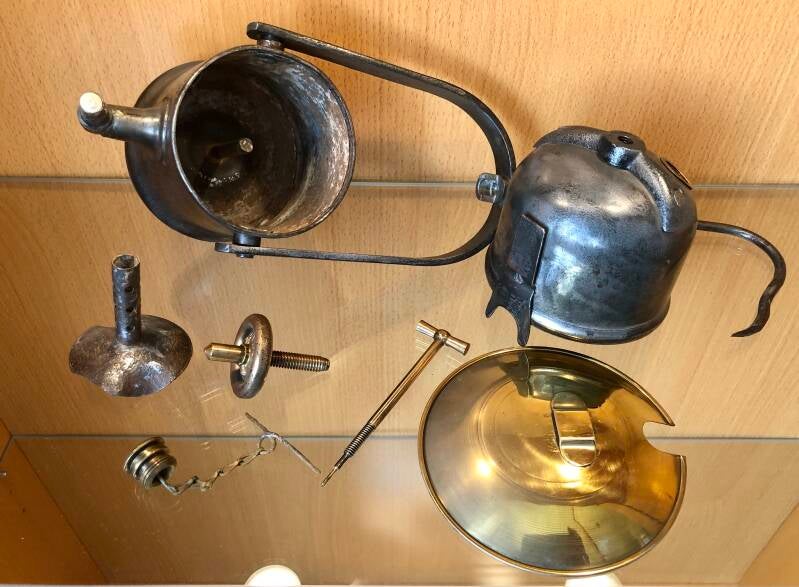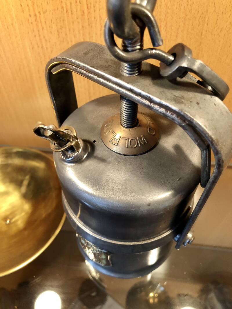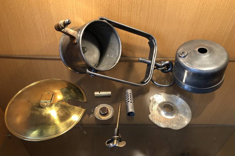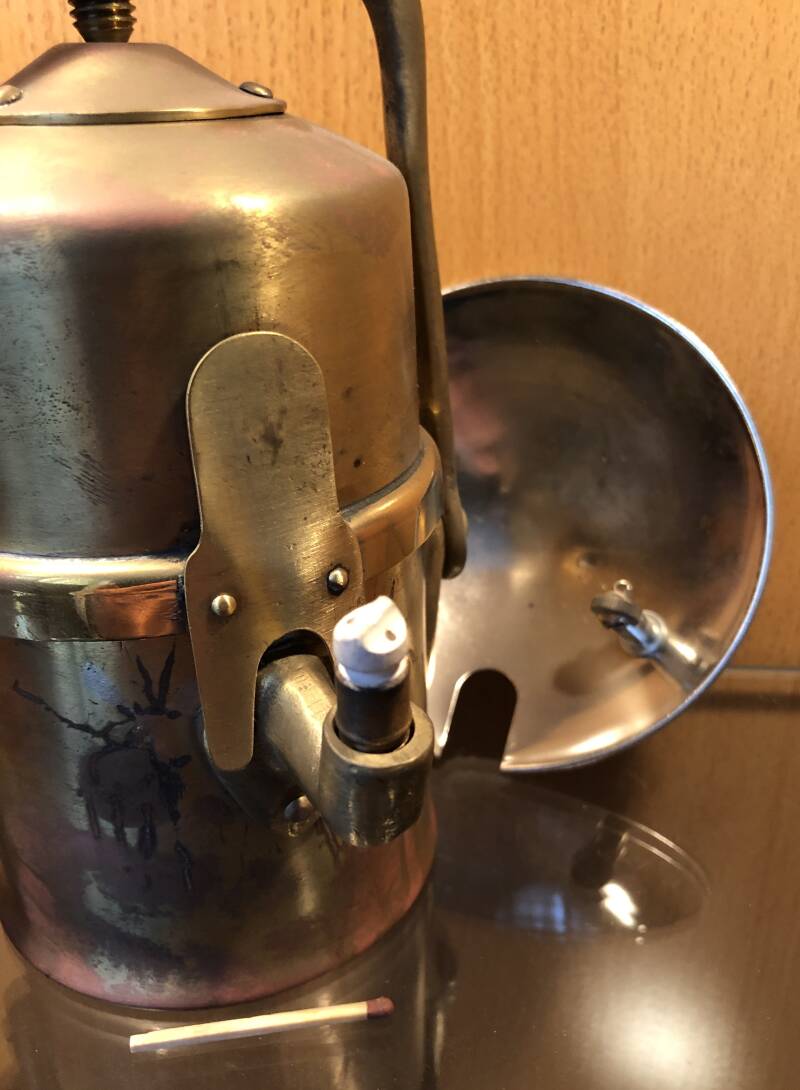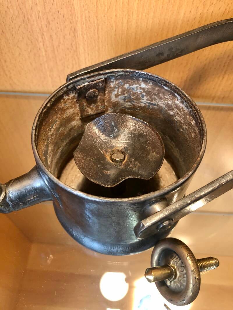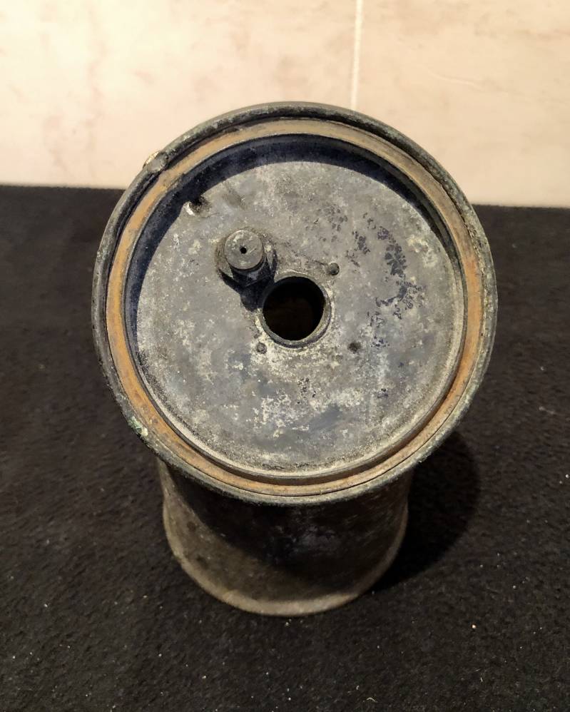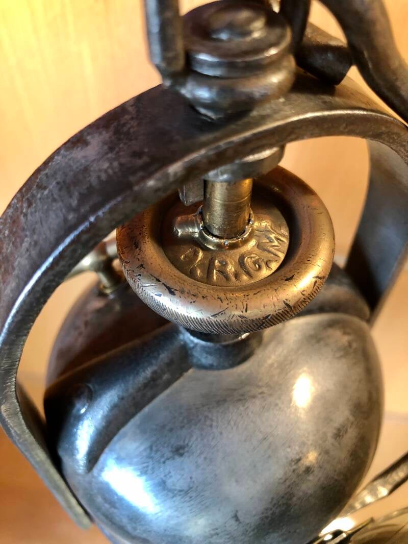 Iron Cap Lamp with Markings Stamped into the Water Canister.
