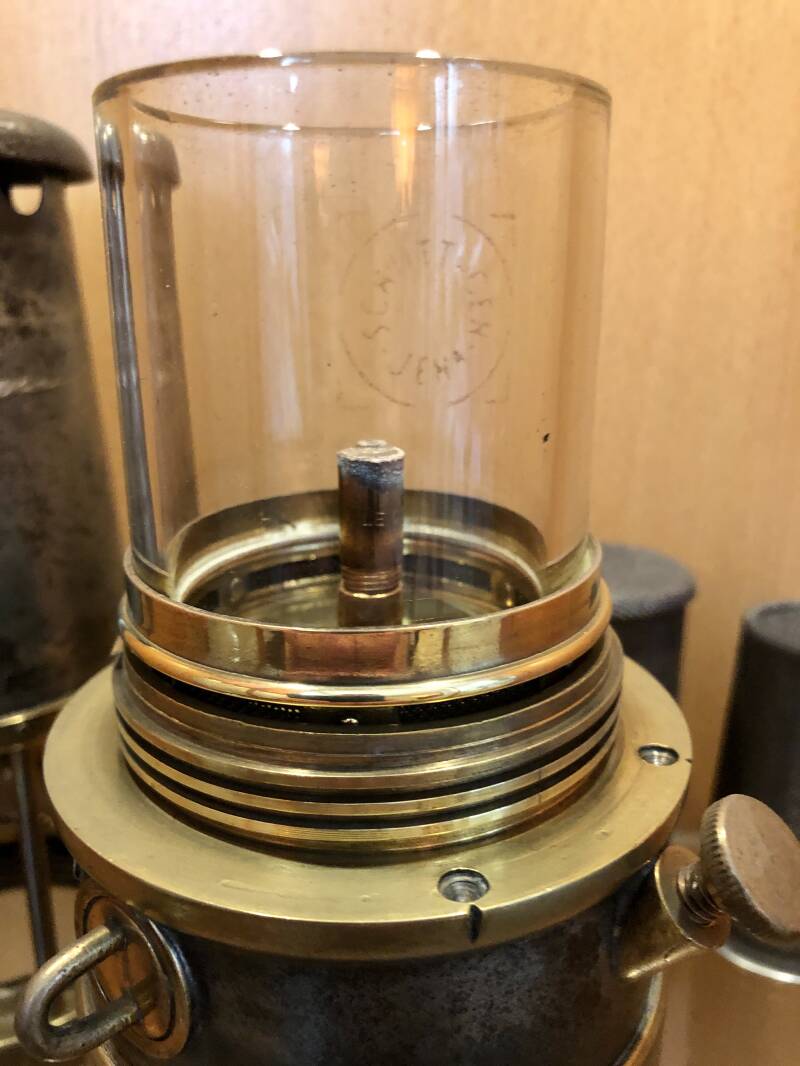 This Lamp is the Simplified Version of the German Type 800 Carbide Safety Lamp. The Flat Top is Typical for a Great-Britain Production. Lamp is complete and All Parts are Original and in Working Condition. Even the Old Schott Jena Glass is Present.