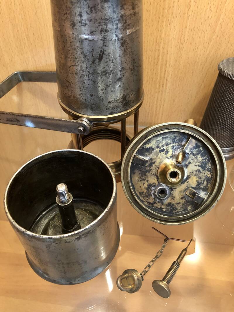 Lamp is New and in Unfired Conditon. All Parts are Original and the Lamp has a Beautiful Brass Name Tag. Very Rare Waterinlet, i.e. the Brass Part has a Dual Function of both Closing the Water Tank and Distributing the Pressure Once Locking the Lamp. Extremely Seldom to Find in this Condition. Lamp is Complete, no Dents, No Scratches, +/- 1940